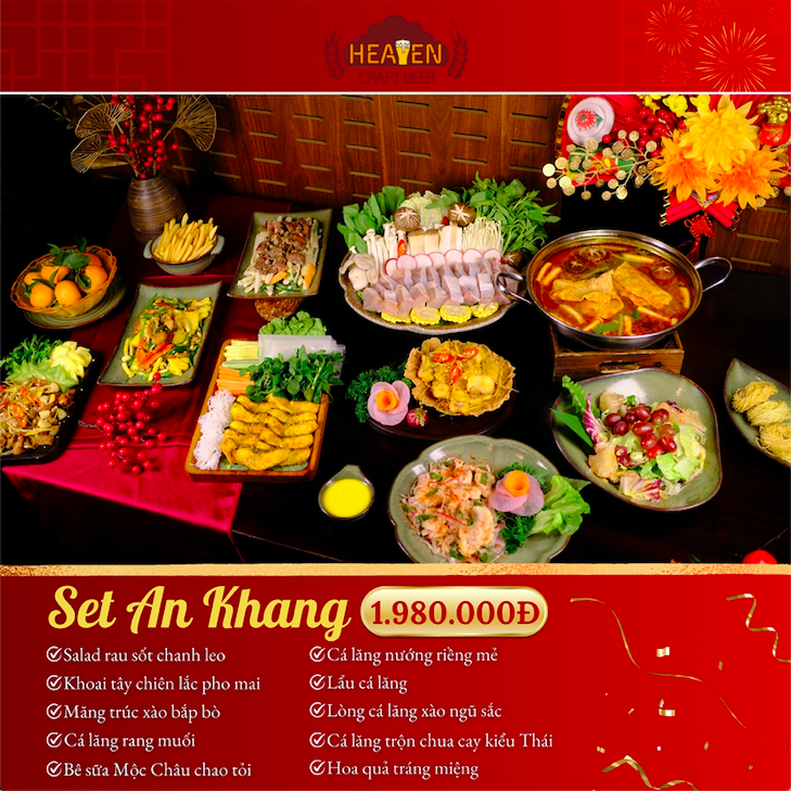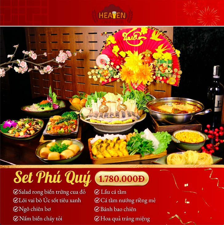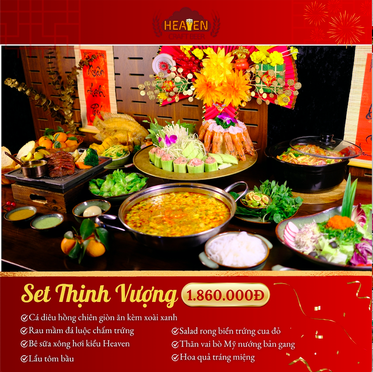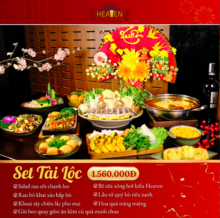 Set menu Tết của nhà hàng Heaven Beer luôn là lựa chọn được nhiều gia đình, doanh nghiệp và nhóm bạn ưu tiên mỗi dịp xuân về. Không chỉ giúp tiết kiệm thời gian gọi món, set menu còn mang đến một mâm tiệc đầy đủ – trọn vị – ý nghĩa sum vầy, phù hợp cho không khí Tết Nguyên Đán.
